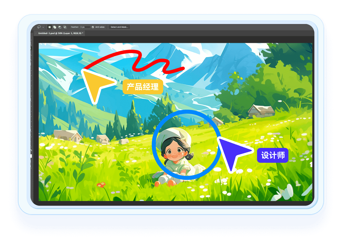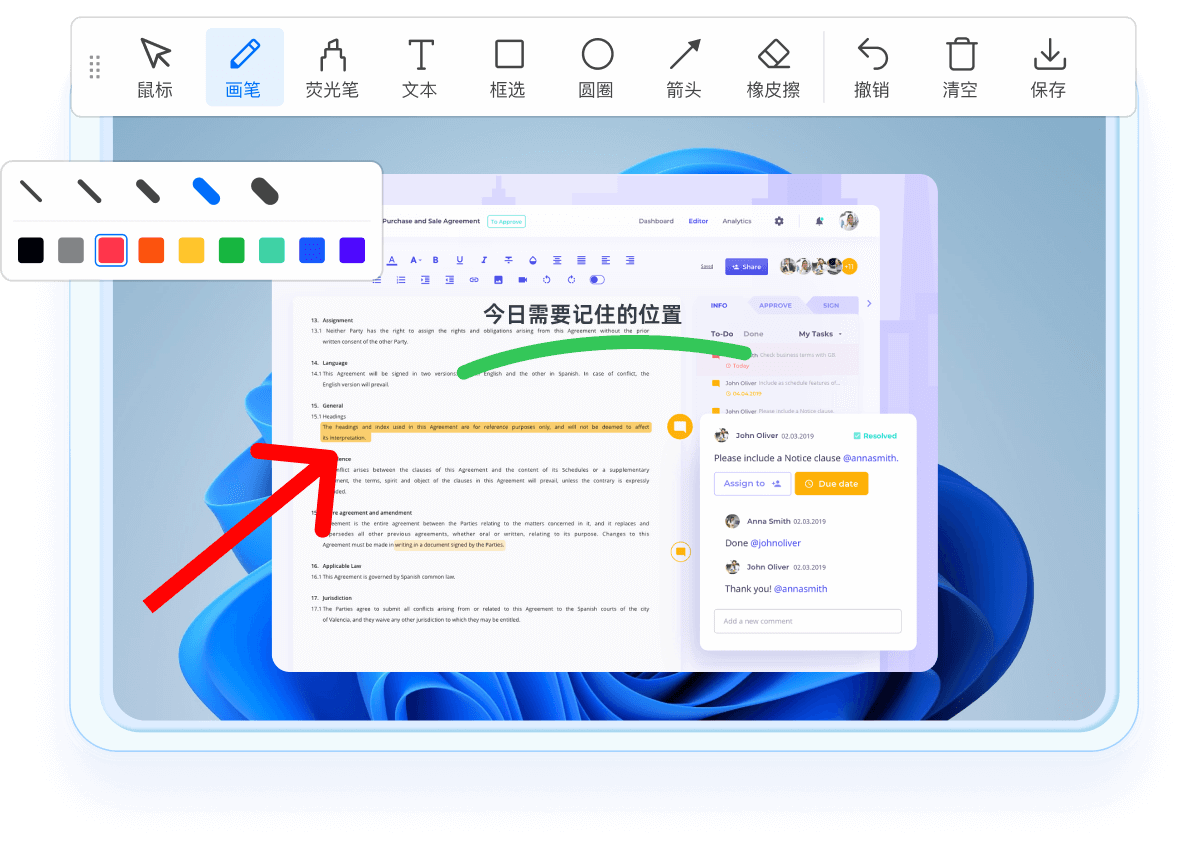 在远程控制或屏幕共享时,任何一方都可以开启「白板」工具。使用画笔、箭头、文字等工具在当前屏幕画面上进行圈点、批注和高亮,使沟通和指示更加清晰直观。