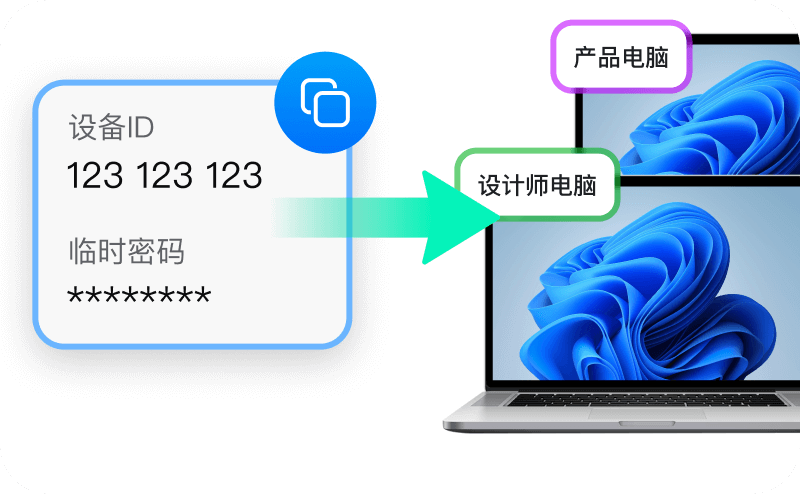 被控方将自己的「设备ID」和「临时密码」同时发送给多个主控方(如PM、设计师、开发)。