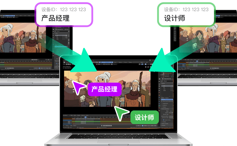 所有人使用相同的ID和密码,即可同时连接并控制同一台设备,屏幕上会显示多个带名字的光标。