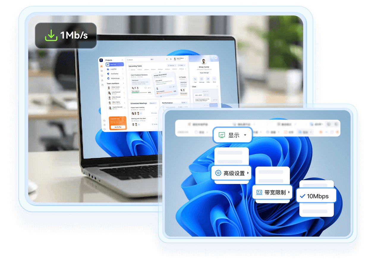 担心远程办公占满家庭或公司带宽?您可以在被控端手动设置ToDesk可占用的最大上传带宽(如10Mbps),在保证自己流畅使用的同时,也不影响他人共享网络。